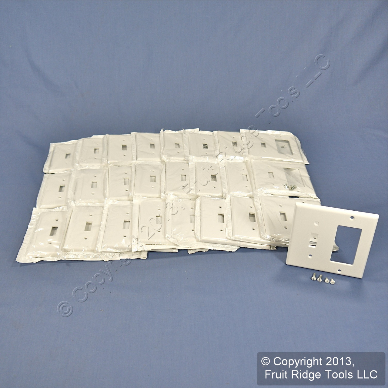 25 Leviton 80405-W white combination Decora and toggle switch wallplates. Residential Grade, standard size (4.5"h x 4.56"w) with a rectangular opening that will fit Decora or GFCI devices. Features include: