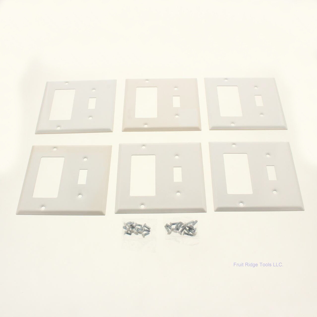 6 Amerelle #C970TRWVP white steel 2-gang combination toggle/decorator wallplates. Please note there are some minor surface scratches on these plates as well as some mars on the corners. Aslo, these plates are no longer pure white as there has been some discoloring from the sun. Amerelle products are created with high-quality, durability, and style in mind. This pack of 6 toggle/rocker switch wallplates will enable you to have some uniformity in your home when it comes to your outlet covers. Each package comes with the necessary screws to install it. Covers are extremely easy to install. Simply line up over the hole of the outlet and screw in with the proper drill.
