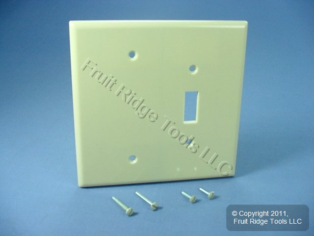Leviton 86106 ivory wallplate. Residential Grade with one toggle switch opening and one blank box-mount space. Good for custom applications or to cover a vacant space when a fixture has been removed from a 2-gang box. Oversize dimensions, measuring 5.25"h x 5.31"w, 3/4" higher and wider than standard wallplates to provide maximum coverage of wall irregularities. Features include:
