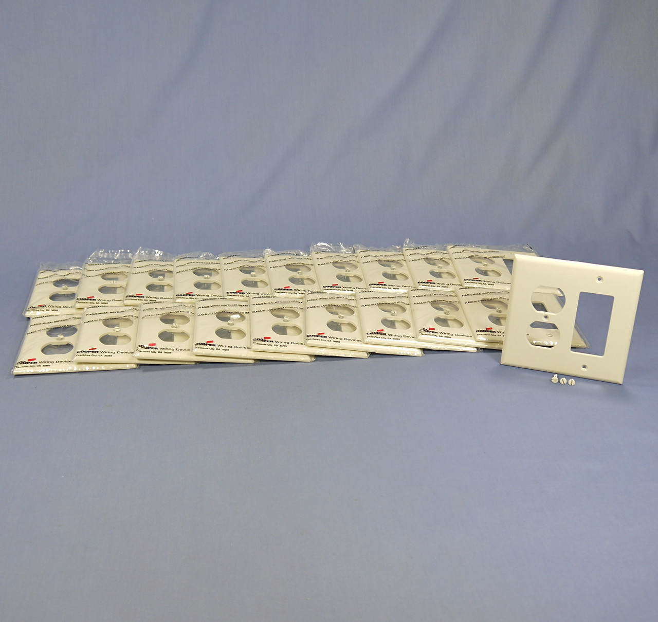 20 Cooper PJ826LA light almond 2-gang combination toggle switch and Decorator/GFCI covers. Each wallplate has one duplex outlet opening and one rectangular opening which is compatible with standard GFCI and Decorator type devices. Commercial Specification Grade, made of a high-performance unbreakable polycarbonate for high abuse environments; do not confuse them with regular residential grade wallplates which can chip and crack. Mid-Size, measuring 4.875"h x 4.938"w, 3/8" higher and wider than standard size covers for use with larger size wall boxes and to hide irregularities on the surrounding wall. Features include: