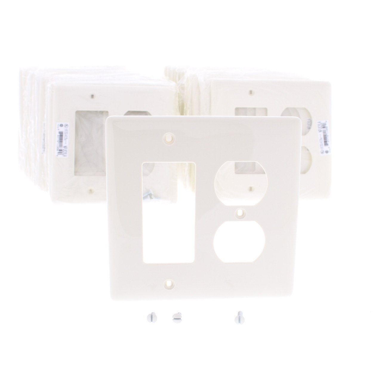 25-pack of Hubbell NPJ826LA light almond 2-gang combination duplex outlet and Decorator/GFCI/rocker covers. Each wallplate has one duplex receptacle opening and one rectangular opening which is compatible with standard GFCI, rocker switch, and Decorator type devices. Commercial Grade, Mid-Size, measuring 4.88"h x 4.94"w, 3/8" higher and wider than standard wallplates for use with larger size wall boxes and to hide irregularities on the surrounding wall. Made of a tough unbreakable thermoplastic for use in more demanding environments such as commercial locations - do not confuse with with regular residential grade wallplates which can chip or crack. Ideal for schools, hospitals, industrial or other applications where good looks, strength and durability are required. Each is individually packaged; packaging may differ from photos. Features include: