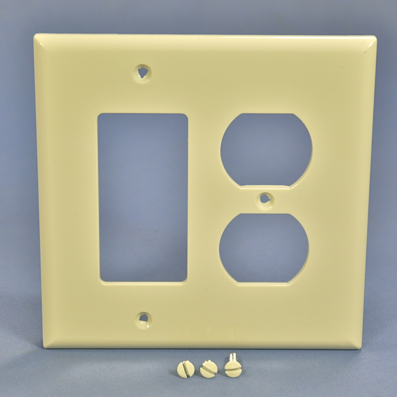 Cooper PJ826LA light almond 2-gang combination toggle switch and Decorator/GFCI cover. Each wallplate has one duplex outlet opening and one rectangular opening which is compatible with standard GFCI and Decorator type devices. Commercial Specification Grade, made of a high-performance unbreakable polycarbonate for high abuse environments; do not confuse them with regular residential grade wallplates which can chip and crack. Mid-Size, measuring 4.875"h x 4.938"w, 3/8" higher and wider than standard size covers for use with larger size wall boxes and to hide irregularities on the surrounding wall. Features include: