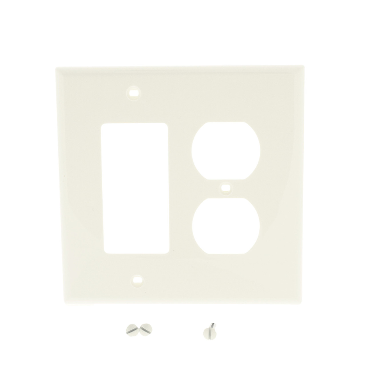 Leviton PJ826-T light almond 2-gang combination toggle switch and Decora/GFCI cover. Each wallplate has duplex outlet opening and one rectangular opening which is compatible with standard GFCI and Decora type devices. Commercial Grade, made of a high-performance unbreakable thermoplastic for high abuse environments; do not confuse them with regular residential grade wallplates which can chip and crack. Midway size, measuring 4.88"h x 4.94"w, 3/8" higher and wider than standard size covers for use with larger size wall boxes and to hide irregularities on the surrounding wall. Features include: