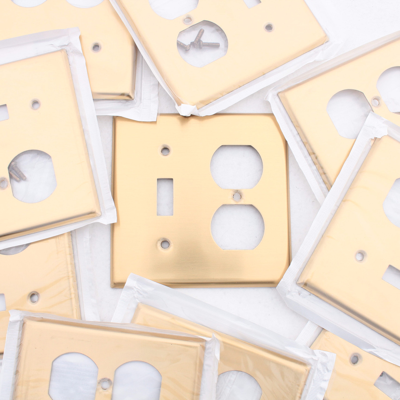 10 Leviton 81005 solid satin brass 2-gang wallplates. Commercial grade, standard size plate, measuring 4.50"h x 4.56"w with one toggle switch opening and one duplex receptacle opening. Made of .040" thick solid brass with a satin finish. Features include: