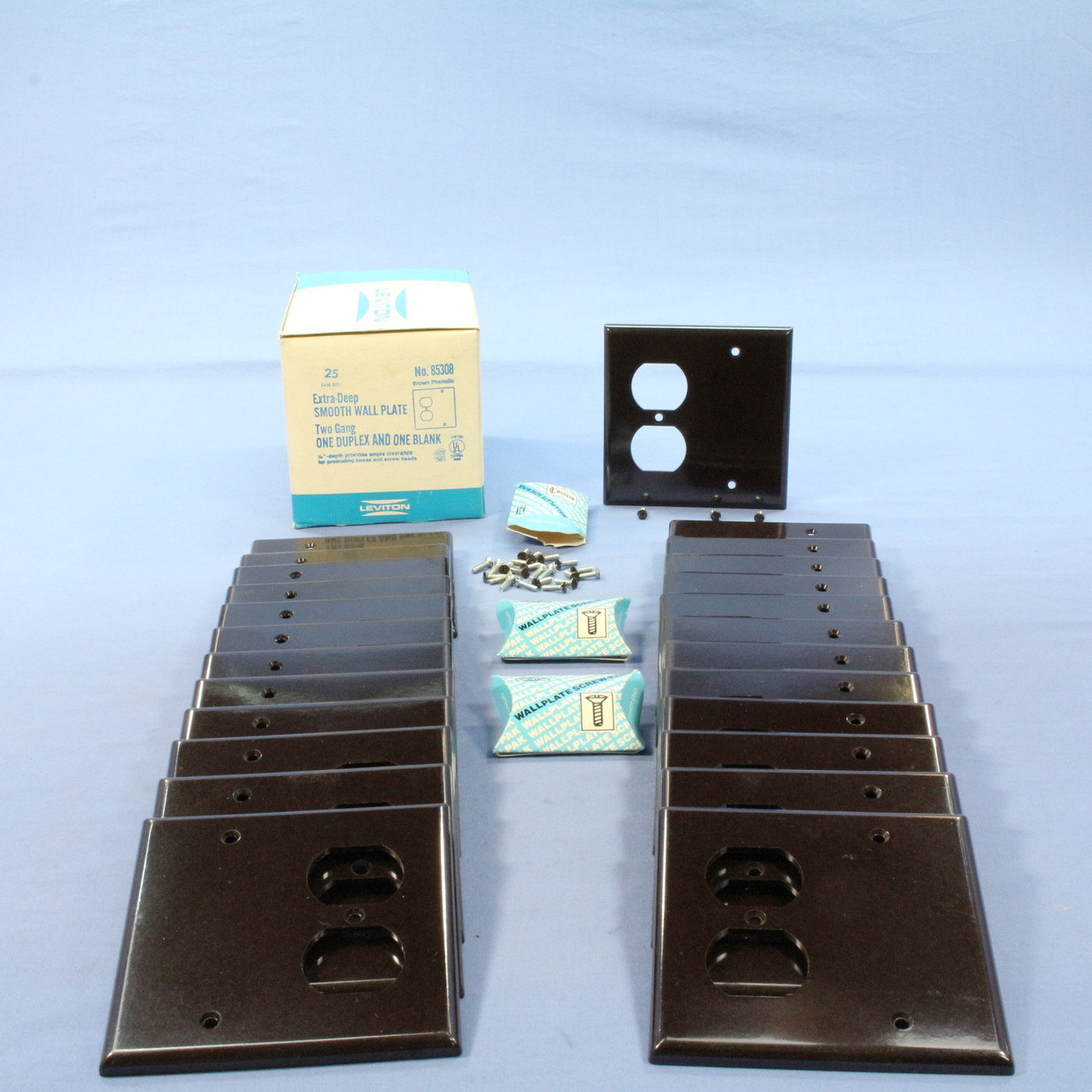 25 Leviton 85308 brown extra deep 2-gang combination wallplates. Each has one duplex receptacle outlet opening and one blank space. Residential Grade, standard size plate, measuring 4.5"h x 4.56"w. Extra deep design provides 3/16" depth behind the plate to assure a flush fit to the wall surface in installations where particular devices protrude too far. This is approximately 1/16" greater clearance behind the plate than a standard plate and yields an overall thickness of 0.25". Features include: