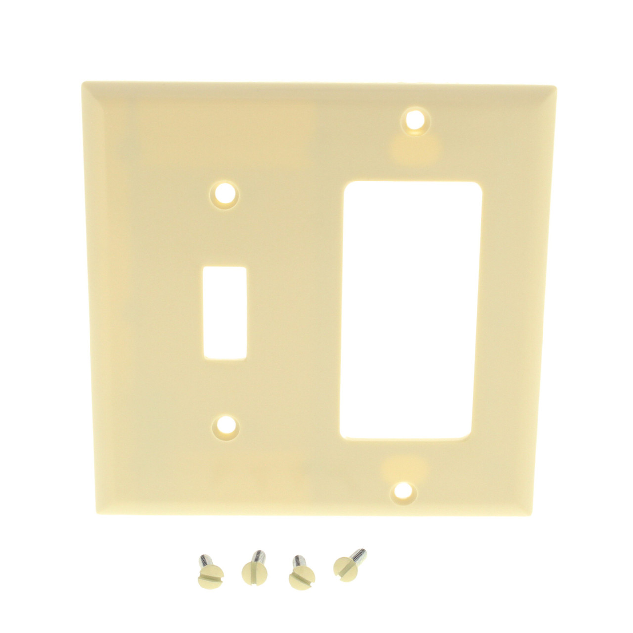 Cooper 2153V ivory combination Decorator and toggle switch thermoset wallplate. Standard Grade, standard size (4.5"h x 4.563"w) with a rectangular opening that will fit Decorator or GFCI devices. Features include: