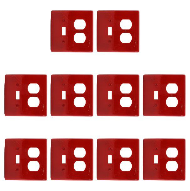 10 Hubbell NPJ18R red combination switch/outlet wallplates. The bright red color is great for locations where you want to call attention to a switchplate: garages, workshops, utilities, etc. Commercial Grade, made of a high-performance unbreakable nylon for high abuse environments; do not confuse them with regular residential grade wallplates which can chip and crack. Mid-Size, measuring 4.875"h x 4.938"w, 3/8" higher and wider than standard size covers for use with larger size wall boxes and to hide irregularities on the surrounding wall. Features include: