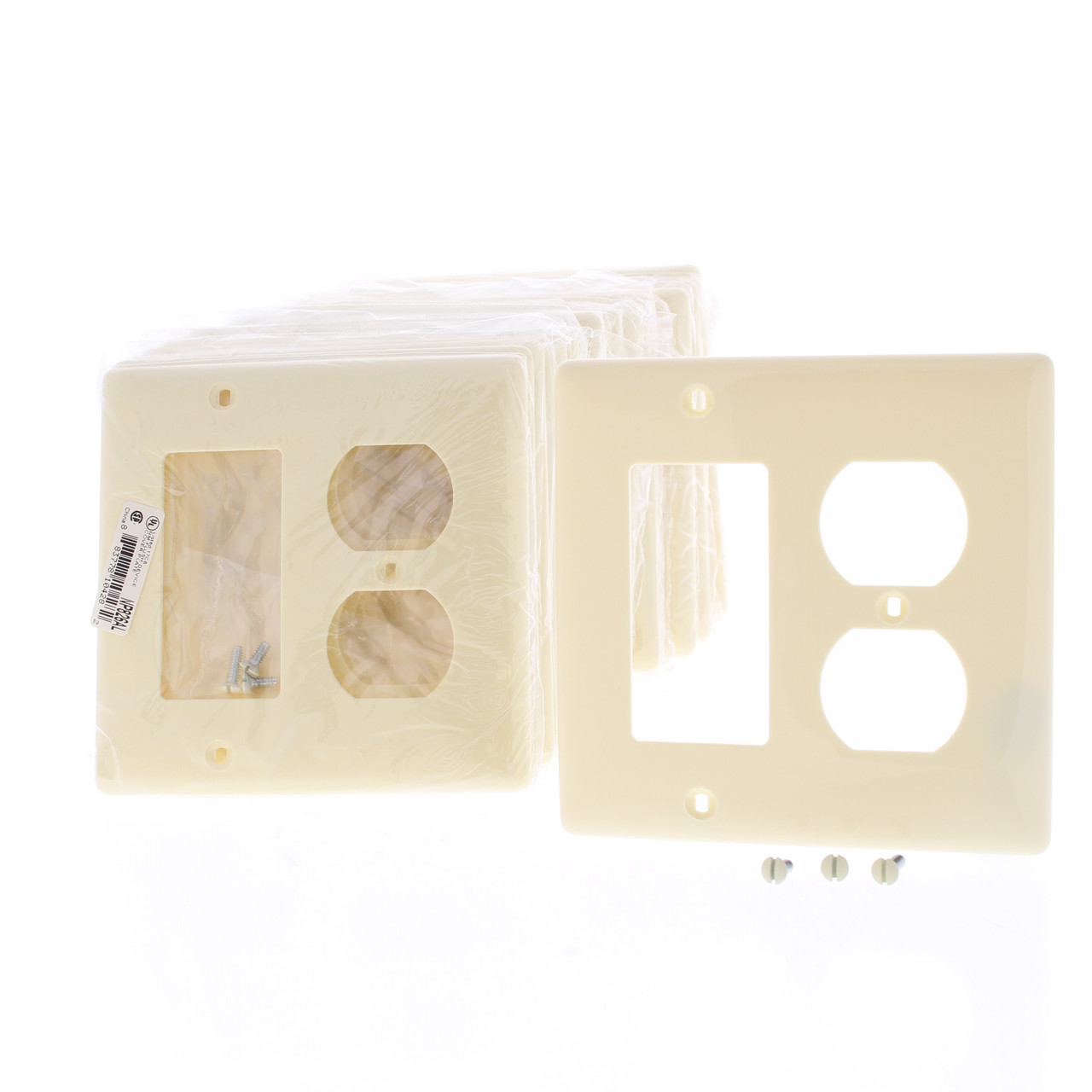 25 Hubbell NP826AL almond 2-gang combination duplex outlet/decorator wallplates. Commercial grade cover with slightly oversize dimensions, measuring 4.63"h x 4.68"w, an extra 1/8" in length and width than standard plates from other manufacturers for increased coverage around irregular wall openings. Made of a tough virtually unbreakable nylon - do not confuse it with regular plastic residential plates which can chip or crack. Features include: