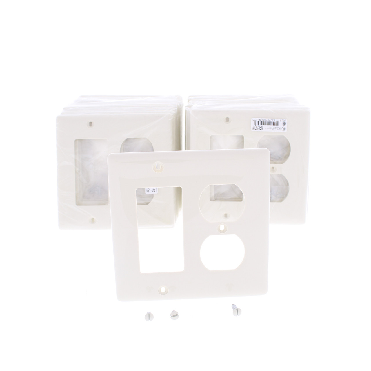 25 Hubbell NP826OW "Office White" (beige) 2-gang combination duplex outlet/decorator wallplates. Please note: Hubbell's "Office White" color is an off-white beige color; it is not a standard bright white - this is a special Hubbell color - popular in home offices, corporate offices, places of worship, etc. Commercial grade cover with slightly oversize dimensions, measuring 4.63"h x 4.68"w, an extra 1/8" in length and width than standard plates from other manufacturers for increased coverage around irregular wall openings. Made of a tough virtually unbreakable nylon - do not confuse it with regular plastic residential plates which can chip or crack. Features include: