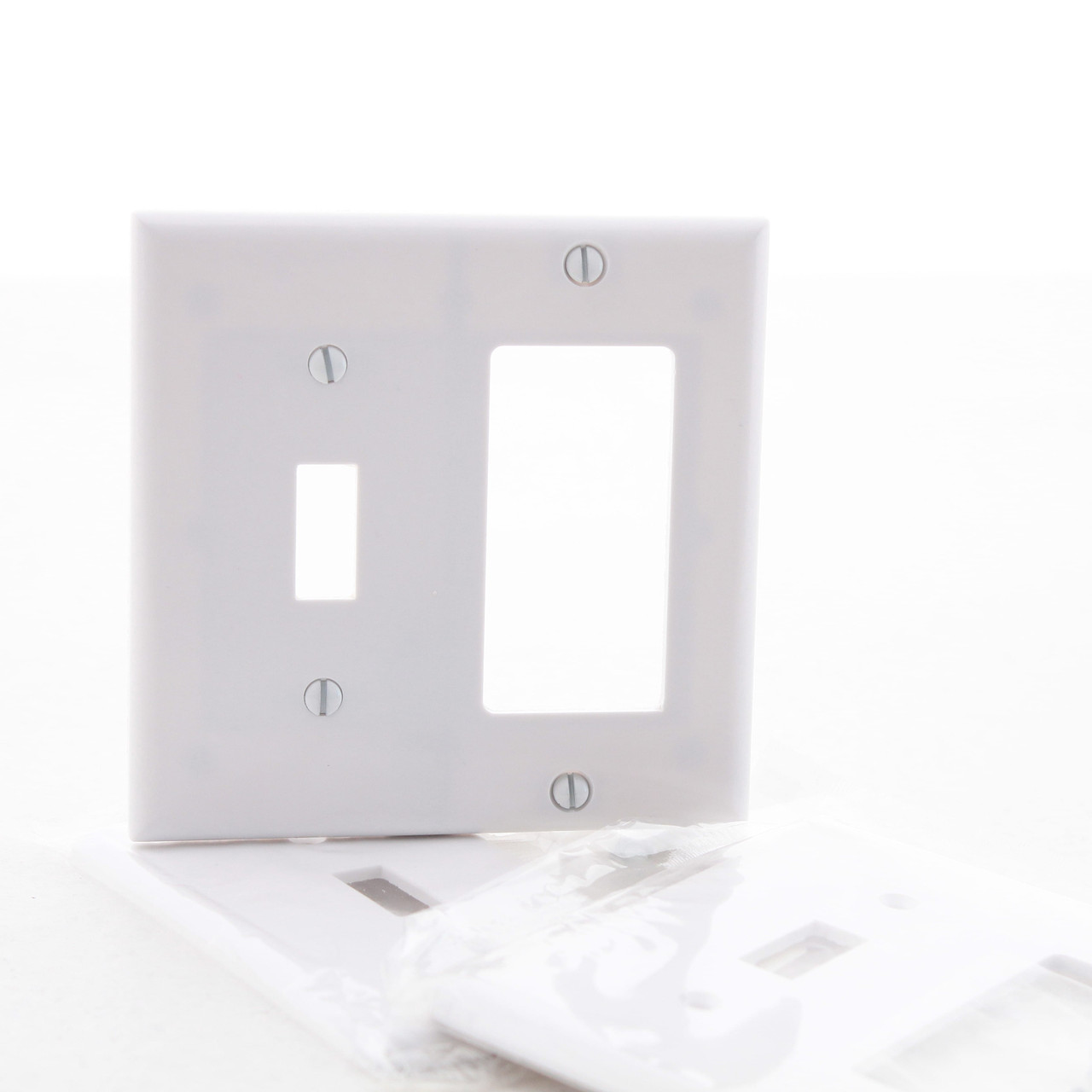 3 Cooper 2153W white combination Decorator and toggle switch thermoset wallplates. Standard Grade, standard size (4.5"h x 4.563"w) with a rectangular opening that will fit Decorator or GFCI devices. Features include: