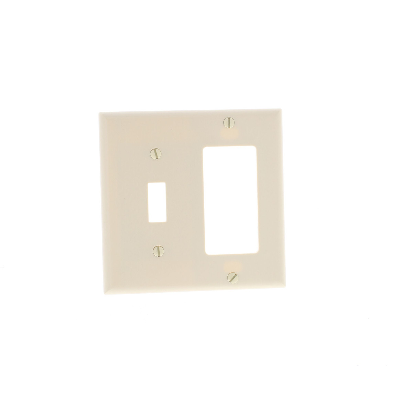 Eaton 2153V ivory combination Decorator and toggle switch thermoset wallplate. Standard Grade, standard size (4.5"h x 4.563"w) with a rectangular opening that will fit Decorator or GFCI devices. Features include: