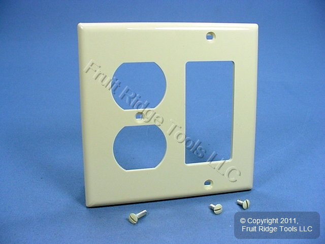 Leviton 80746-I ivory 2-gang combination duplex outlet/Decora wallplate. Commercial grade, standard size plate (4.5"h x 4.56"w) with one duplex receptacle opening and one Decora/GFCI opening. Made of a high performance unbreakable thermoplastic material - do not confuse this with regular Residential Grade wallplates which can chip or crack. Features include: