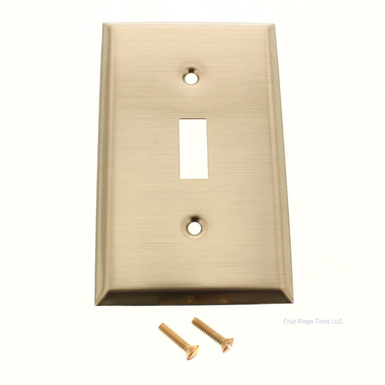 Creative Accents 9AB101 1-gang toggle switch wallplate with an antique brass finish (manufactured by Jackson Deerfield). 1-gang brass plated steel cover with one toggle switch opening. Standard size, measuring 4.50"h x 2.75"w. Each is individually packaged with matching mounting screws.