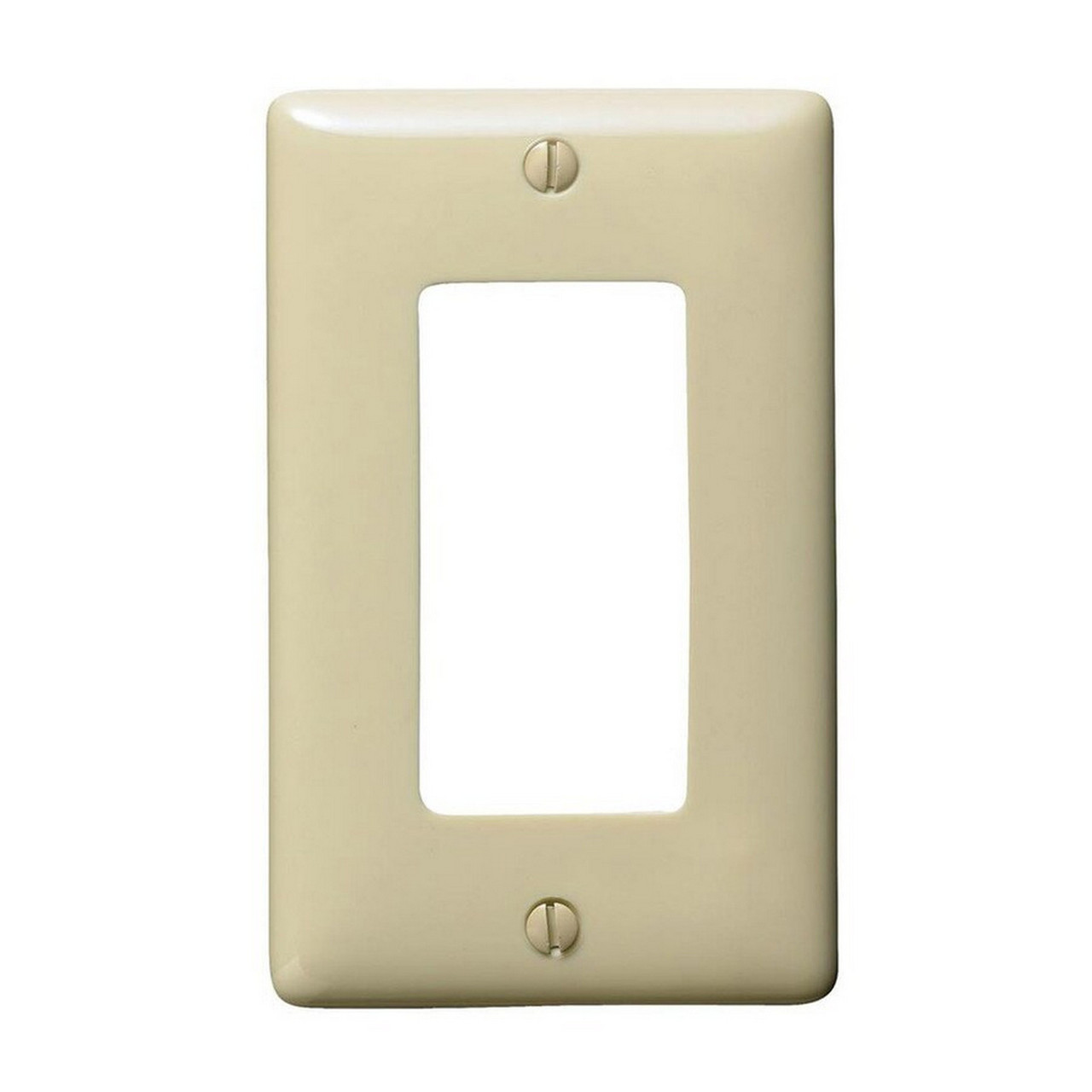 Hubbell 1-Gang Ivory Decorator Jumbo Wall Plate NPJJ26IZ Over-size decorator style Nylon wallplate offers 35% more coverage, hides most wall imperfections. Virtually unbreakable nylon provides impact and chemical resistance. Smooth gloss finish is attractive and easier to clean. Smooth gloss finish with curved corners for improved aesthetics and cleaning ability. Captive screw feature holds included color matching plate screws in place. Reinforced ribs for extra strength and a better fit. Measures 5.25" Height x 3.5" Width
