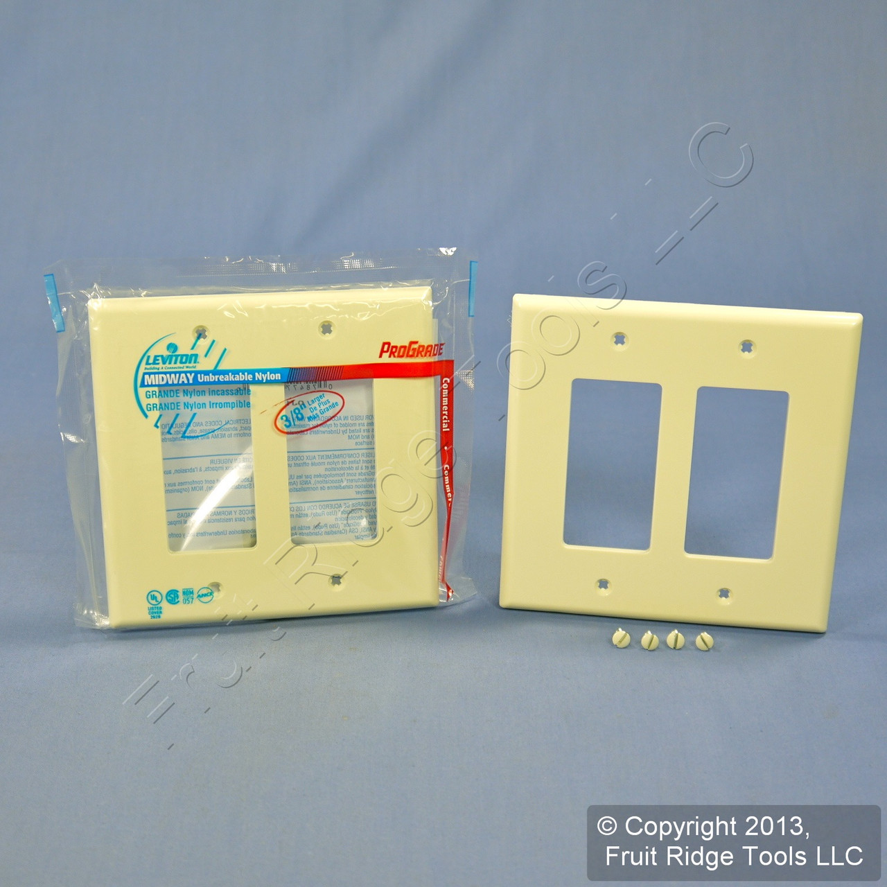 2 Leviton PJ262-A almond Decora unbreakable 2-gang wallplates. Commercial Grade, Midway size, made of a high-performance unbreakable thermoplastic for high abuse environments; do not confuse it with regular residential grade wallplates which can chip and crack. Midway size measures 4.94"w X 4.88"h, 3/8" larger in both dimensions than standard size plates and is intended for use with larger volume outlet boxes or to hide irregularities in the surrounding wall. Features include: