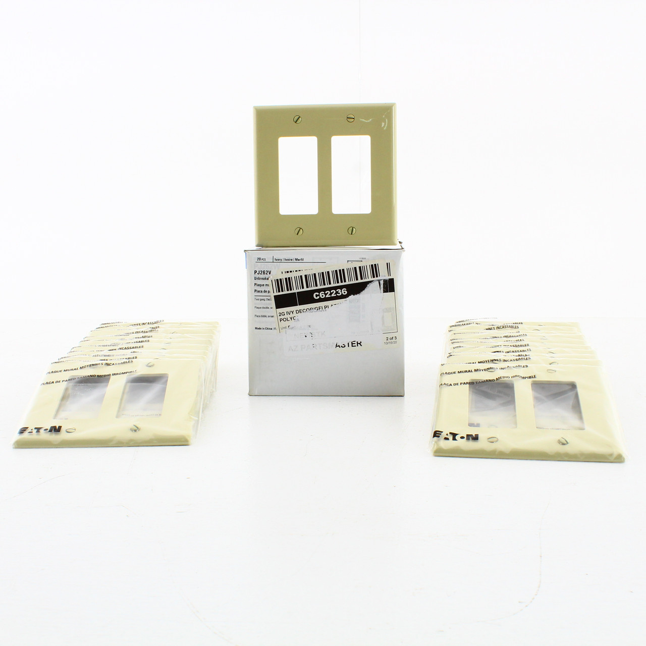 20 Eaton PJ262V ivory Decorator unbreakable 2-gang wallplates. Commercial Specification Grade, Mid-Size, made of a high-performance unbreakable thermoplastic for high abuse environments; do not confuse it with regular residential grade wallplates which can chip and crack. Mid-Size measures 4.938"w X 4.875"h, 3/8" larger in both dimensions than standard size plates and is intended for use with larger volume outlet boxes or to hide irregularities in the surrounding wall. Each is individually packaged; packaging may differ from photos. Features include: