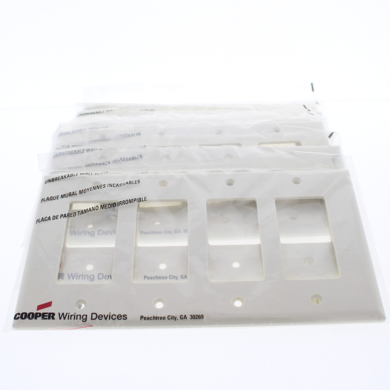 6 Cooper PJ264LA light almond Decorator unbreakable 4-gang wallplates. Commercial Specification Grade, Mid-Size, made of a high-performance unbreakable thermoplastic for high abuse environments; do not confuse it with regular residential grade wallplates which can chip and crack. Mid-Size measures 8.563"w X 4.875"h, 3/8" larger in both dimensions than standard size plates and is intended for use with larger volume outlet boxes or to hide irregularities in the surrounding wall. Each is individually packaged; packaging may differ from photos. Features include: