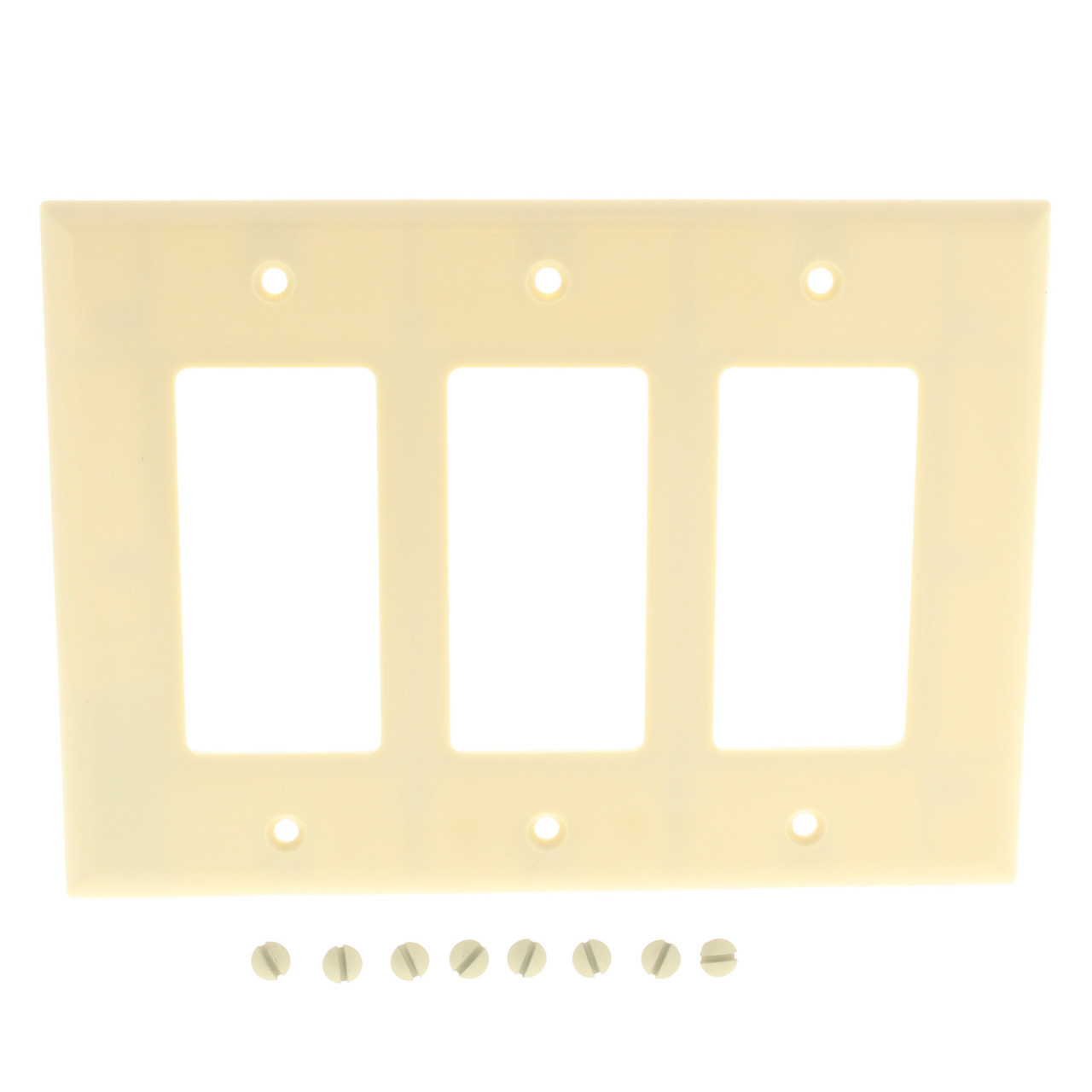 Cooper 2063V ivory Decorator 3-gang thermoset wallplate. Standard Grade wallplate with 3 rectangular openings that are compatible with Decorator and GFCI devices. Mid-size plate measures an oversize 6.75" x 4.875", 3/8" wider and taller than a standard plate to cover large openings or wall irregularities. Features include: