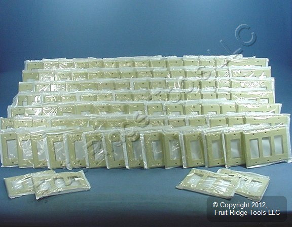 100 Leviton 80411-I ivory decora wallplates. Residential Grade, standard size wallplate with 3-Gang rectangular openings that are compatible with decora and GFCI devices. Features include: