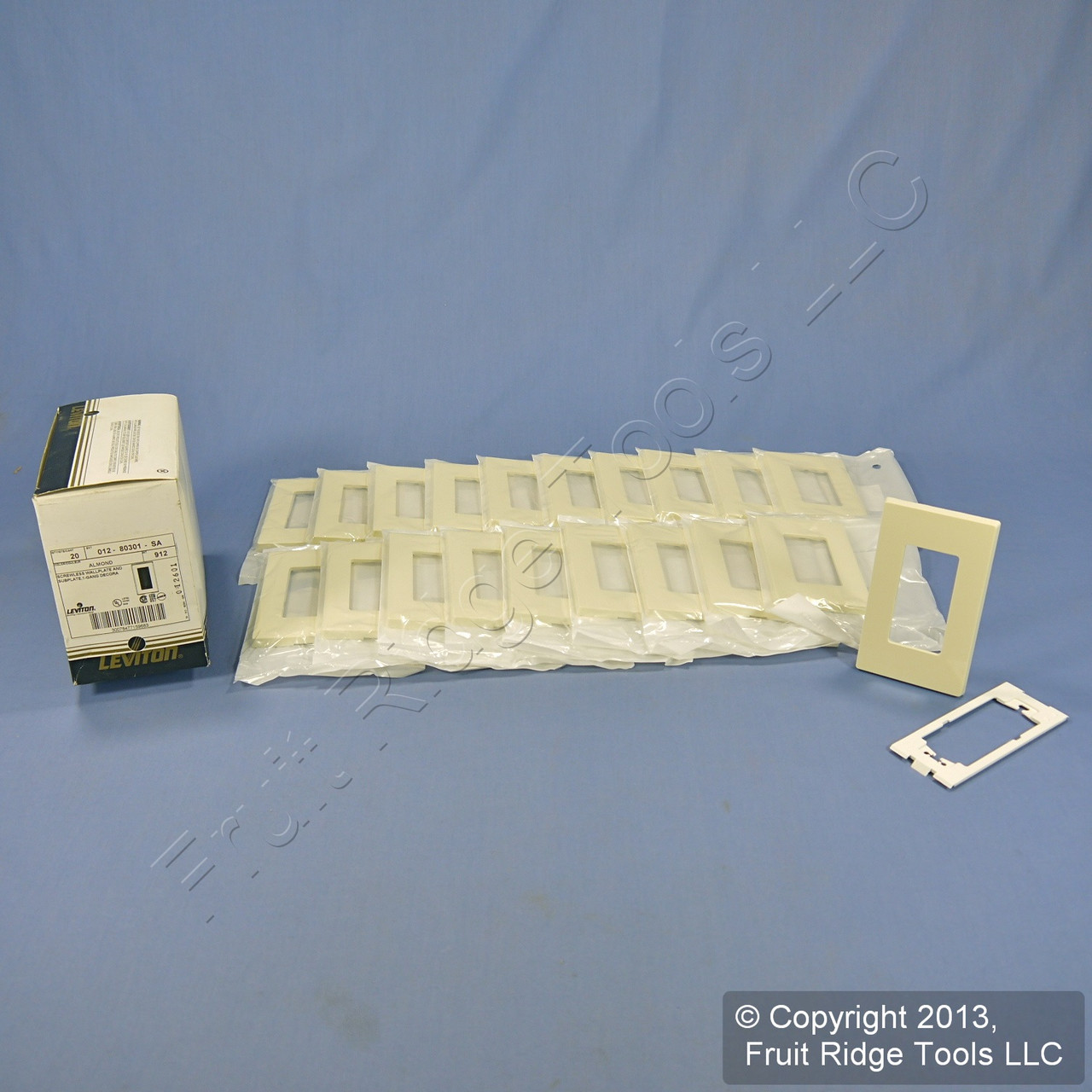 20 Leviton 80301-A almond Decora screwless wallplates. Commercial Specification Grade, screwless/snap-on for a clean crisp look with no visible fasteners. Features include: