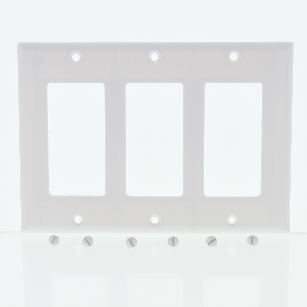 Eaton 2163W white 3-gang Decorator thermoset wallplate. Standard Grade, standard size wallplate, measuring 4.5"w x 6.375"w, with 3-gang rectangular openings that are compatible with Decorator and GFCI devices. Features include: