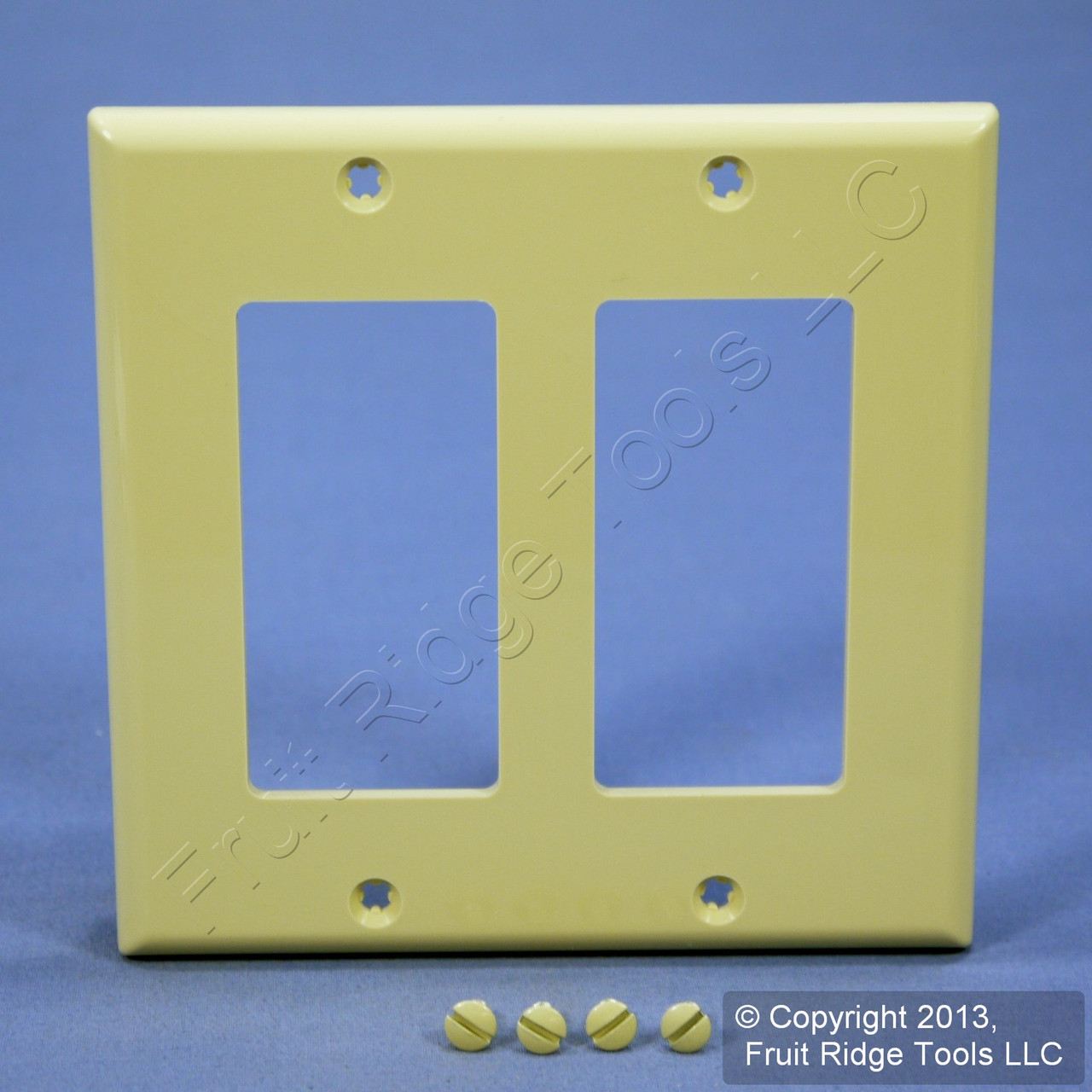 Leviton 80409-NI ivory 2-gang Decora unbreakable wallplate. Commercial Specification Grade, standard size measuring 4.5"H x 4.56"W with rectangular openings that are compatible with Decora and GFCI devices. Made of an unbreakable thermoplastic material - do not confuse it with regular residential grade wallplates which can chip or crack. Features include: