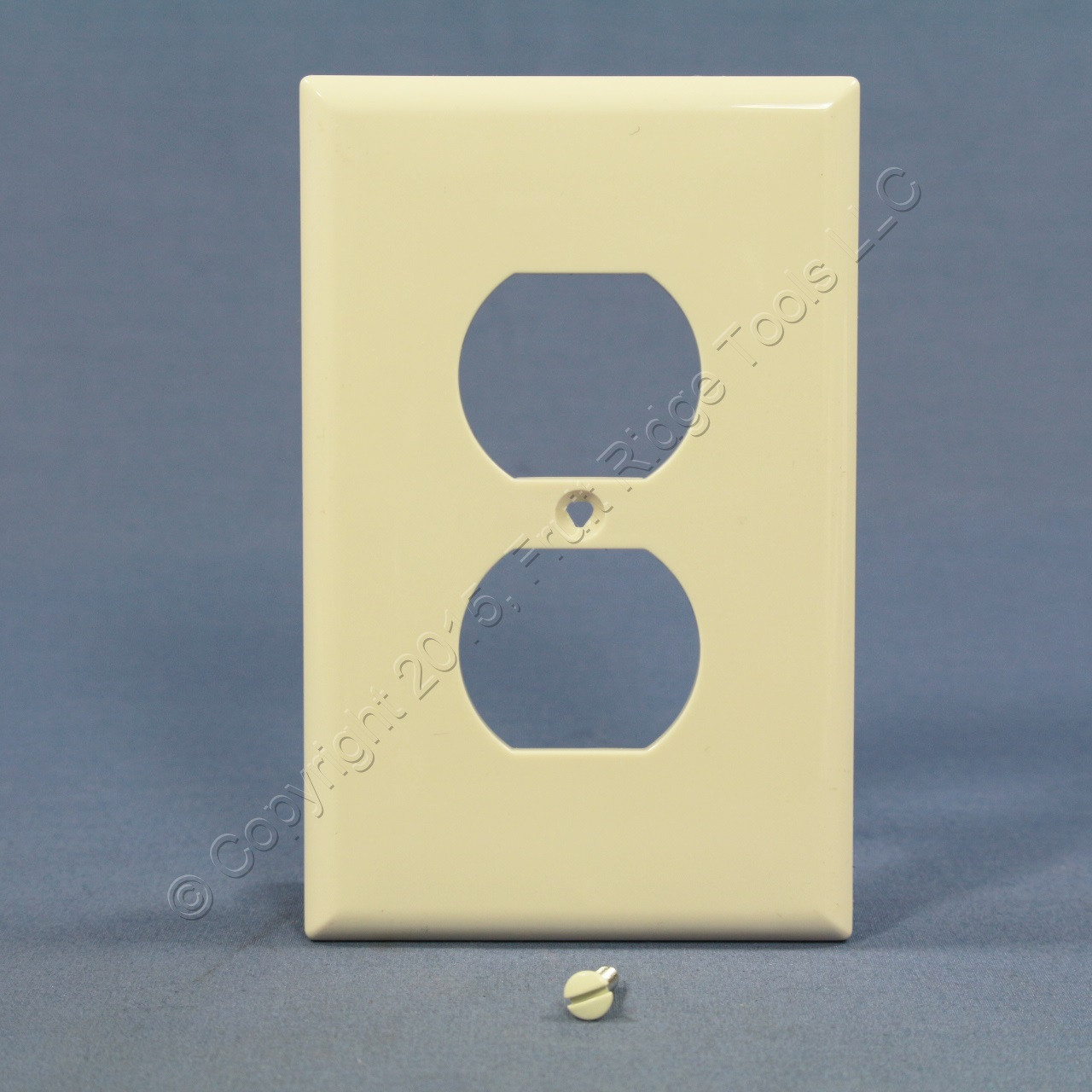 Cooper PJ8LA light almond unbreakable duplex outlet cover wallplate. Commercial Specification Grade, Mid-Size, made of a high-performance unbreakable polycarbonate for high abuse environments; do not confuse it with regular residential grade wallplates which can chip and crack. Mid-Size measures 3.125"w X 4.875"h, 3/8" larger in both dimensions than standard size plates and is intended for use with larger volume outlet boxes or to hide irregularities in the surrounding wall. Each is individually packaged; packaging may differ from photos. Features include: