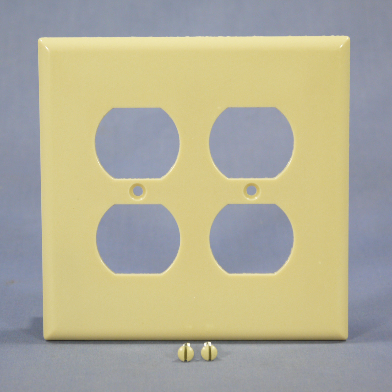 Eagle 2050V ivory 2-gang outlet thermoset cover; Eagle is a division of Cooper Wiring Devices. Standard grade, Mid-size, measuring 4.938"w x 4.875"h, 3/8" higher and wider than standard size covers. Intended for use with larger volume outlet boxes or to hide irregularities in the surrounding wall. Features include: