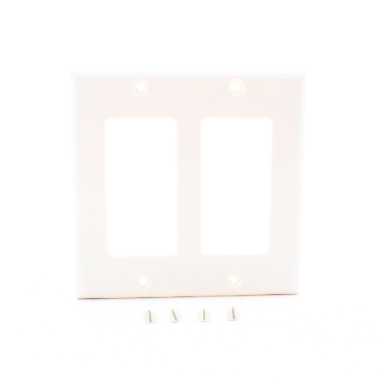 Eaton 5152LA light almond 2-gang Decorator unbreakable wallplate. Commercial Specification Grade, standard size measuring 4.5"H x 4.563"W with rectangular openings that are compatible with Decorator and GFCI devices. Made of an unbreakable thermoplastic material - do not confuse it with regular residential grade wallplates which can chip or crack. Features include: