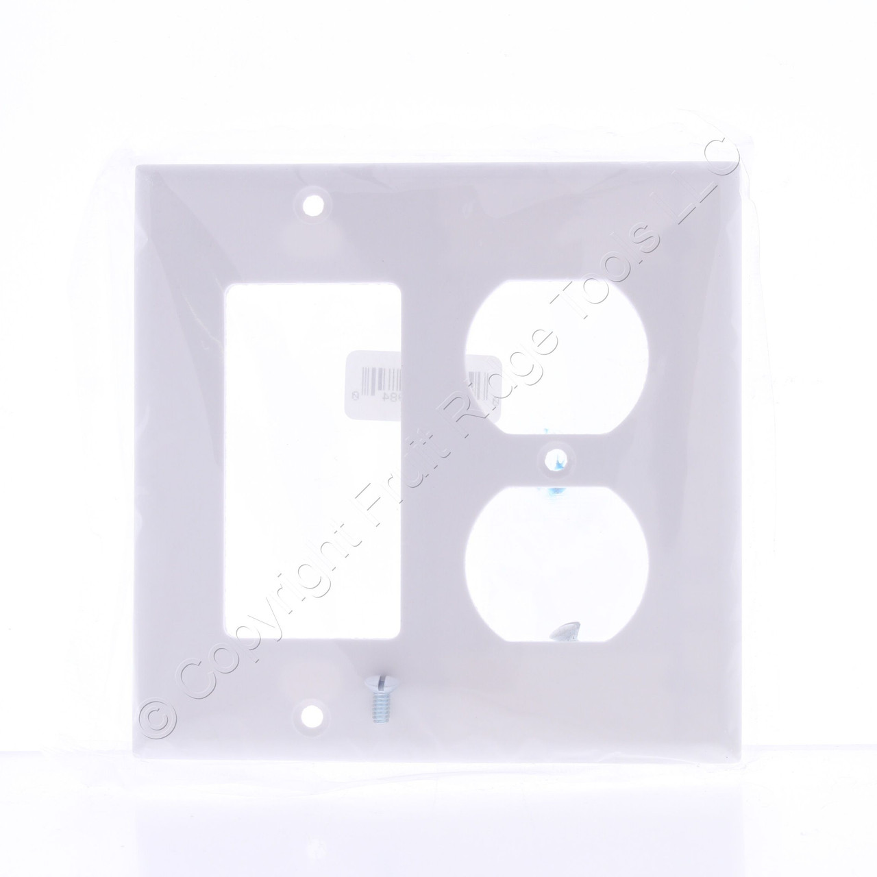 Eaton 2157W white 2-gang combination duplex receptacle & Decorator thermoset wallplate. Decorator opening fits any standard GFCI or Decorator device. It is Standard Grade, standard size wallplate, measuring 4.5"h x 4.563"w. Features include: