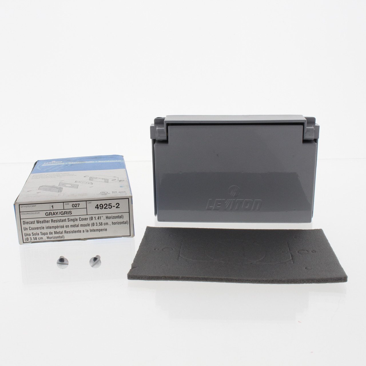 Leviton 4925-2-027 gray horizontal die-cast zinc weather-resistant cover with gasket and 1.41" diameter single receptacle hole. Rugged design made of die-cast zinc with a corrosion resistant gray baked enamel finish. For use with outdoor type surface-mounted outlet boxes or flush-mounted wallboxes. This type of outdoor cover is intended for intermittent use during dry conditions - if you have a situation where you want to leave the plug in place for extended periods of time, consider a "raintight while-in-use" or similar type of cover. Fits standard straight blade single outlets. Features include: