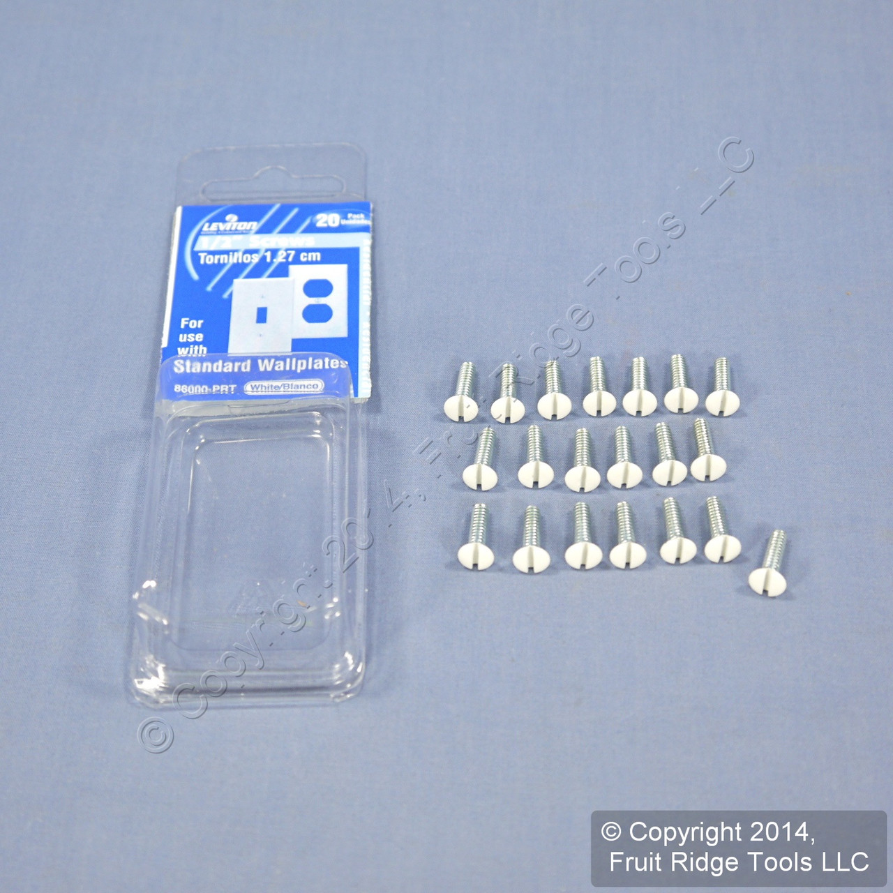 20 Leviton 88000-PRT white 1/2" wallplate screws. Oval head milled slot, 6-32 x 1/2". Fits all standard wallplates.