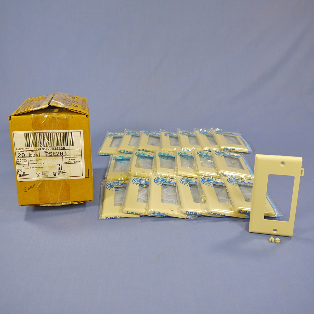 20 Leviton PSE26-I ivory Decora sectional wallplates. It is an end section with a standard Decora/GFCI opening and a dimmer filler plate; it can be reversed for left or right hand installation. This is made of a tough unbreakable thermoplastic material for high impact resistance. Each is individually packaged with the mounting strap and matching mounting screws.