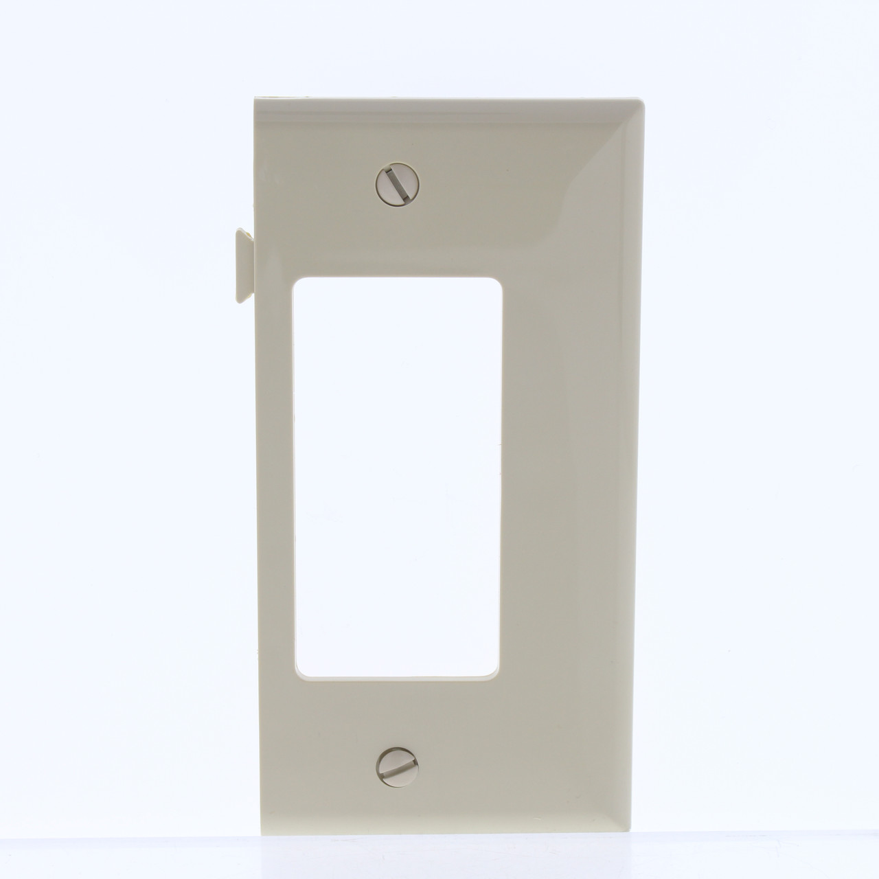 Cooper #STE26V ivory end sectional decorator cover wallplate. Unique Screw Catch feature holds mounting screw captive for easy installation. Thermoplastic construction for durability and flexibility. Mid-Size design to fit over most existing wall openings (4.875" high). Screws are already attached for easy mounting. Easy to snap together and lock to create custom multigang wallplates.