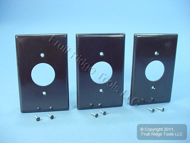 3 Leviton 80504 brown receptacle wallplates. Residential Grade, Midway size with a 1.406" diameter hole. Measures 3-1/8"wx4-7/8"h, 3/8" wider and higher than standard size wallplates for use with larger volume outlet boxes or to hide irregularities in the surrounding wall. Fits standard straight blade single outlets such as Leviton 8210, 8310, 5261, 5361, 5661, 5461, 5251, 5651, 5351, 5088, 5089, 5891, 5823, 5015, 5029, 5801, 5821, and 5032. Features include: