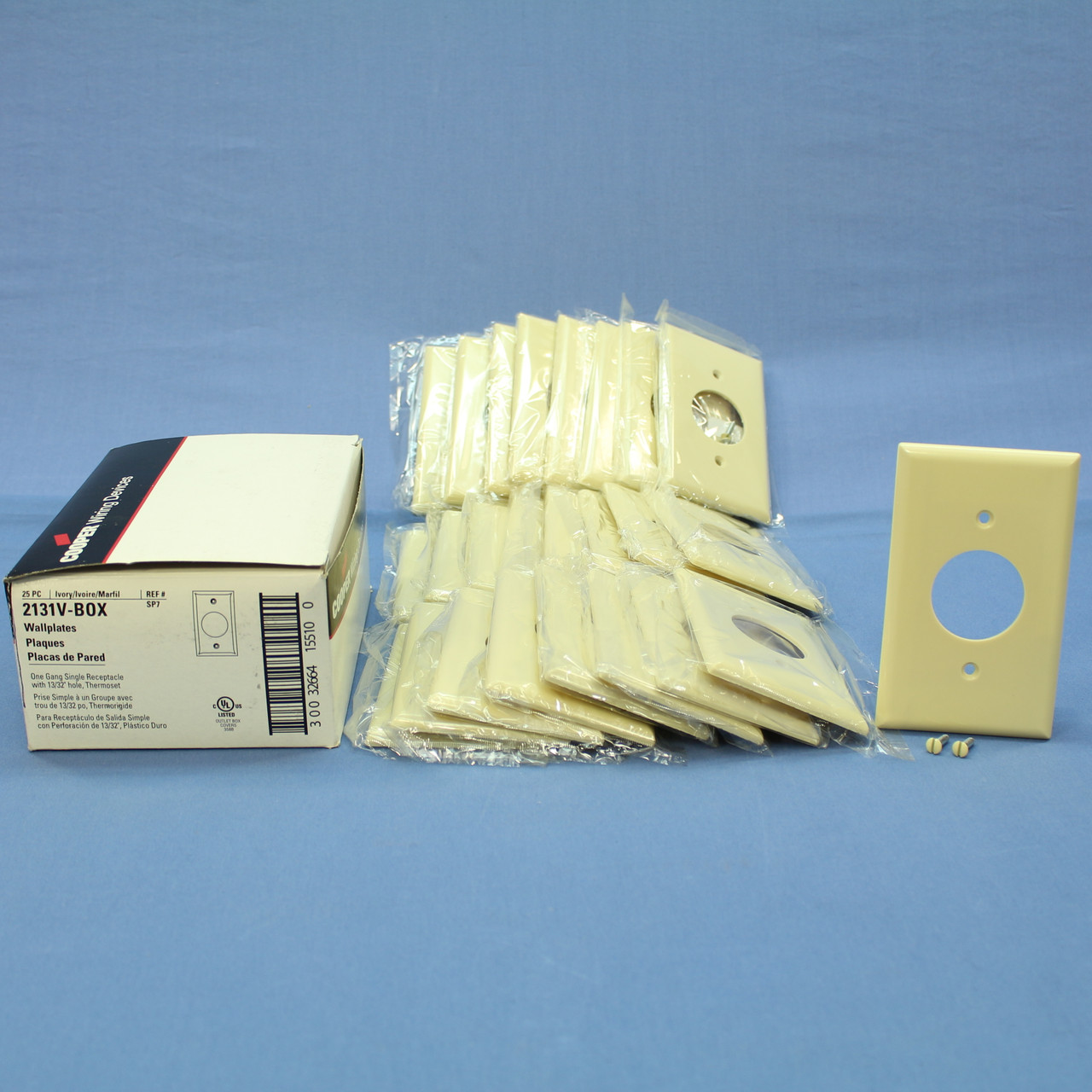 25 Cooper 2131V ivory single receptacle thermoset wallplates. Standard grade, standard single gang size, measuring 4.5"h x 2.75"w with one 1.406" diameter opening. Fits standard straight blade single outlets. Features include: