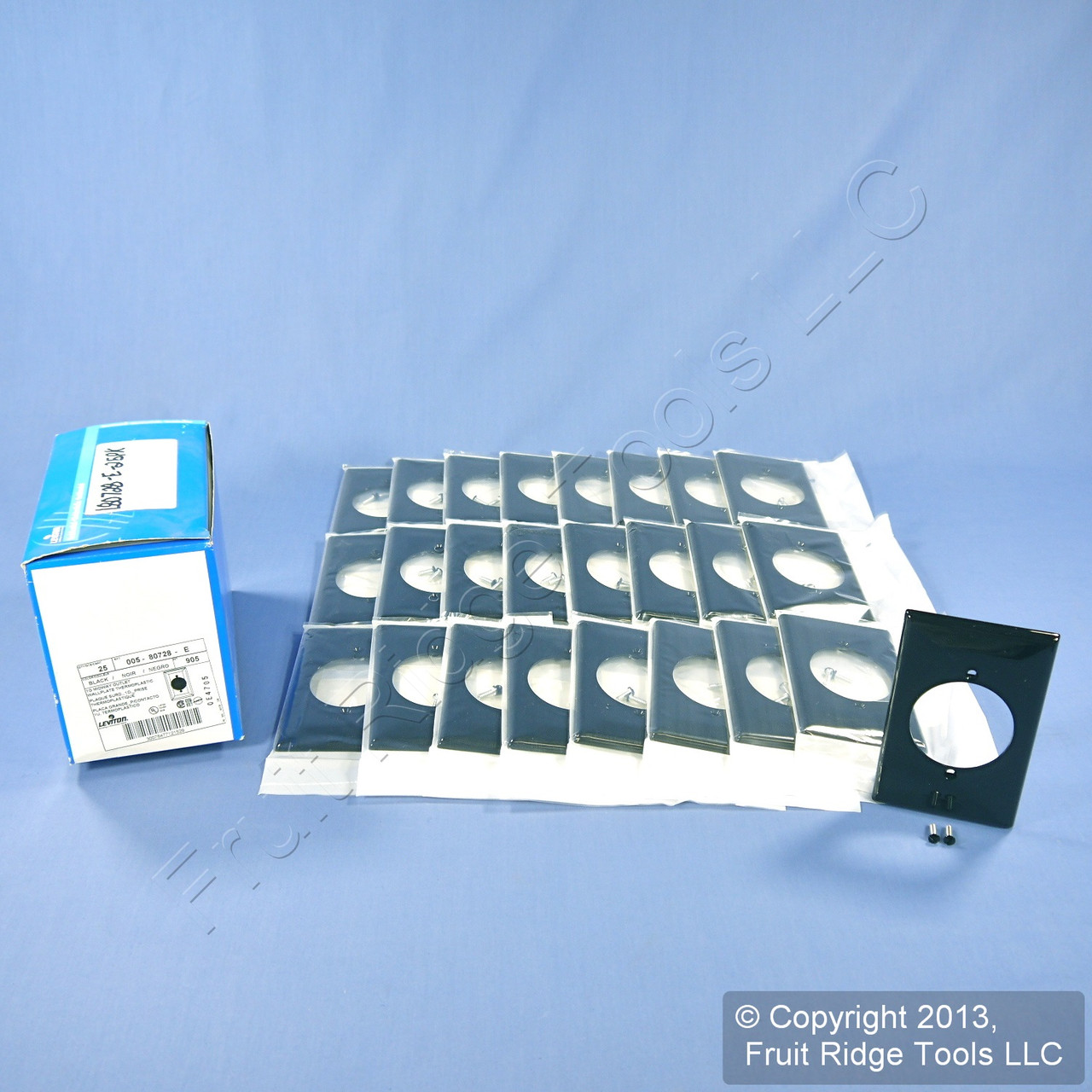 25 Leviton 80728-E black power outlet covers. Commercial grade with 2.15" diameter receptacle opening, made of a tough unbreakable thermoplastic which will not chip or crack. Midway size, measuring 4.88"h x 3.13"w, 3/8" higher and wider than standard size covers for use with larger size wall boxes and to hide irregularities on the surrounding wall. Typically used for straight blade power outlets for dryers, ranges, and welders including the following Leviton part numbers: 278, 279, 5206, 5207, 5371, 5372, 5373, and 5374. Features include: