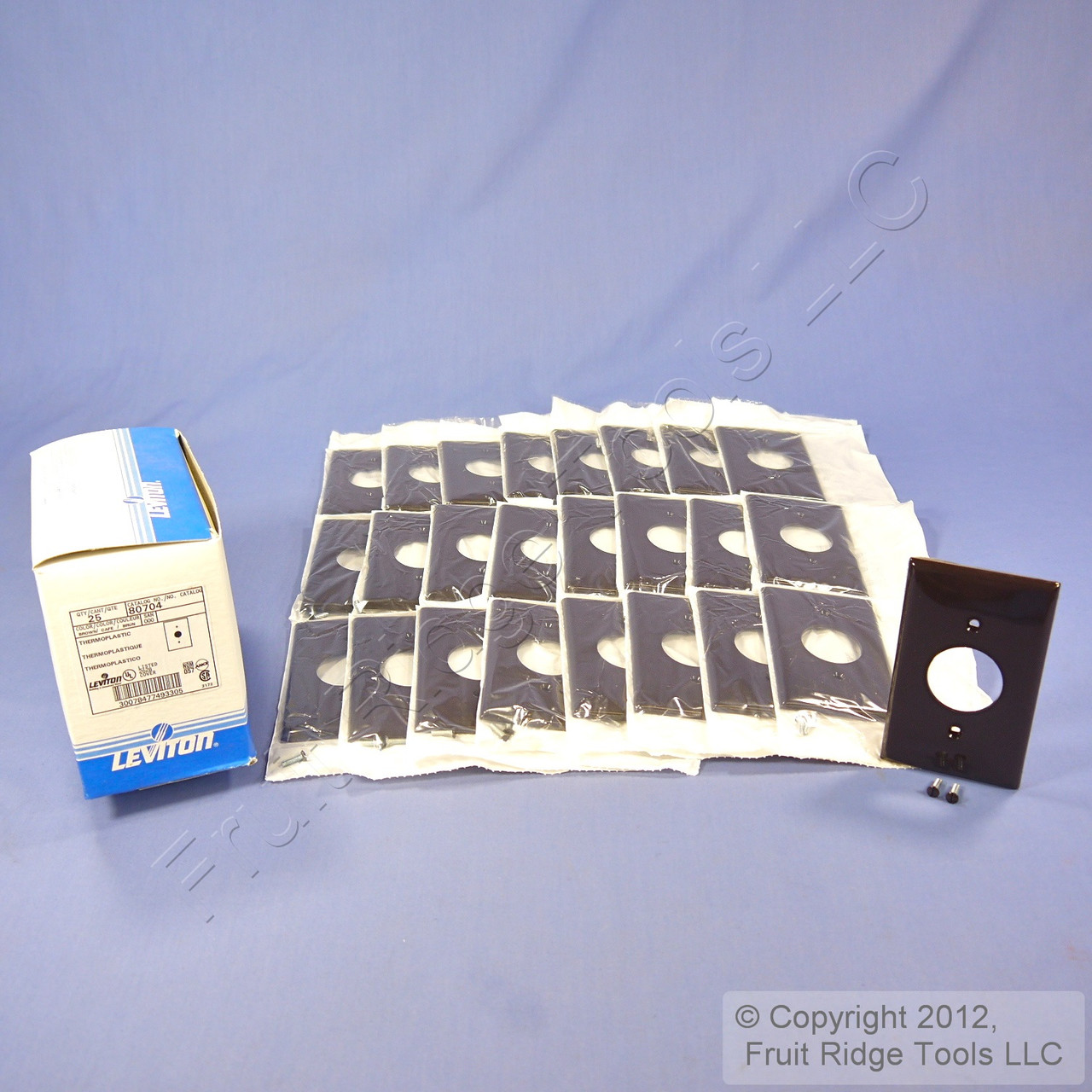 25 Leviton 80704 brown single receptacle nylon wallplates. Commercial Specification Grade, standard size plate, measuring 4.5"h x 2.75"w with a 1.406" diameter center opening. Made of a tough unbreakable thermoplastic for use in high abuse environments - do not confuse them with regular residential wallplates which can chip or crack. Fits standard straight blade single outlet receptacles such as Leviton 8210, 8310, 5261, 5361, 5661, 5461, 5251, 5651, 5351, 5088, 5089, 5891, 5823, 5015, 5029, 5801, 5821, and 5032. Features include: