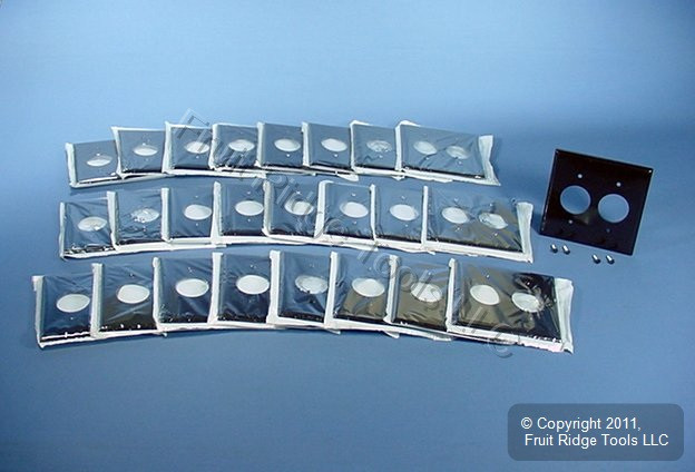 25 Leviton 85052 brown, 2-gang single receptacle wallplates. Residential grade, standard 2-gang size, measuring 4.5"h x 4.56"w with two 1.406" diameter openings. Fits standard straight blade single outlets such as Leviton 8210, 8310, 5261, 5361, 5661, 5461, 5251, 5651, 5351, 5088, 5089, 5891, 5823, 5015, 5029, 5801, 5821, and 5032. Also fits telephone jack platforms such as the >Leviton 40201. Features include: