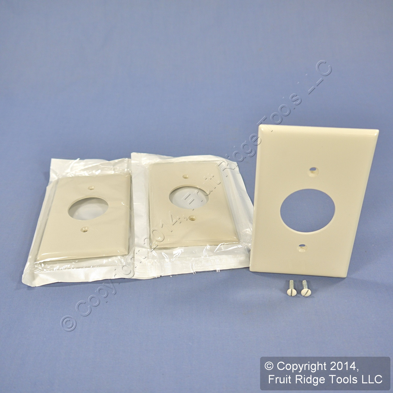 3 Leviton 80704-T light almond single receptacle nylon wallplates. Commercial Specification Grade, standard size plate, measuring 4.5"h x 2.75"w with a 1.406" diameter center opening. Made of a tough unbreakable thermoplastic for use in high abuse environments - do not confuse them with regular residential wallplates which can chip or crack. Fits standard straight blade single outlet receptacles such as Leviton 8210, 8310, 5261, 5361, 5661, 5461, 5251, 5651, 5351, 5088, 5089, 5891, 5823, 5015, 5029, 5801, 5821, and 5032. Features include: