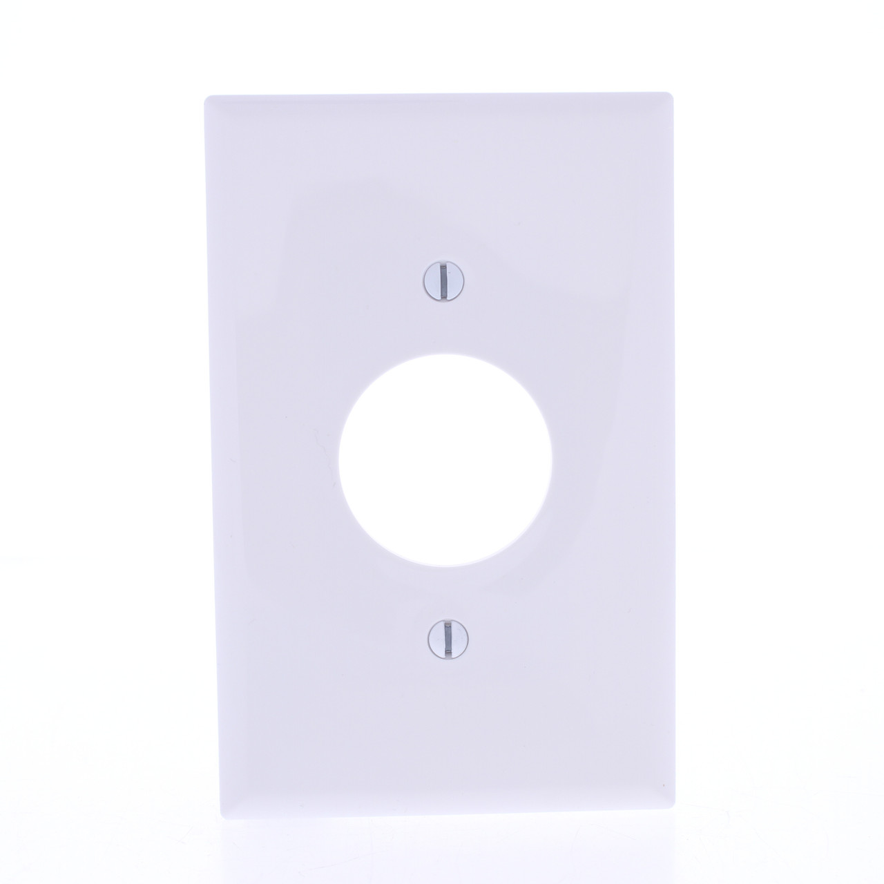 Eaton PJ7W white single receptacle nylon 1-gang wallplate. Commercial Specification Grade, Mid-Size with a 1.406" diameter hole. Measures 4.875"h x 3.125"w, 3/8" wider and higher than standard size wallplates for use with larger volume outlet boxes or to hide irregularities in the surrounding wall. Made of a tough unbreakable polycarbonate for use in high abuse environments - do not confuse them with regular residential wallplates which can chip or crack. Fits standard straight blade single outlet receptacles. Features include:
