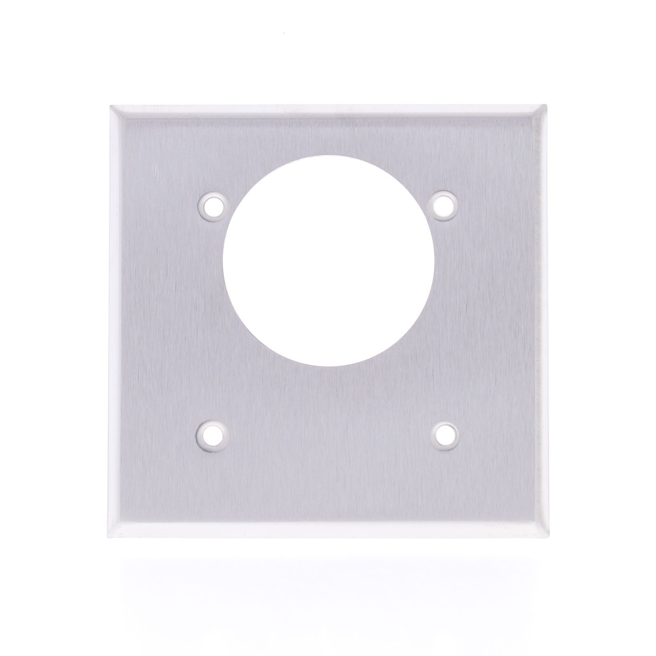Mulberry 97224 2-gang stainless steel wallplate with an offset 2.1625" diameter opening. Typically used for 30A and 50A 3- and 4-wire range/dryer outlets. Commercial Grade, 2-gang standard size cover measuring 4.5"h x 4.562"w. Made of .030" thick Type 430 stainless steel. Features include:
