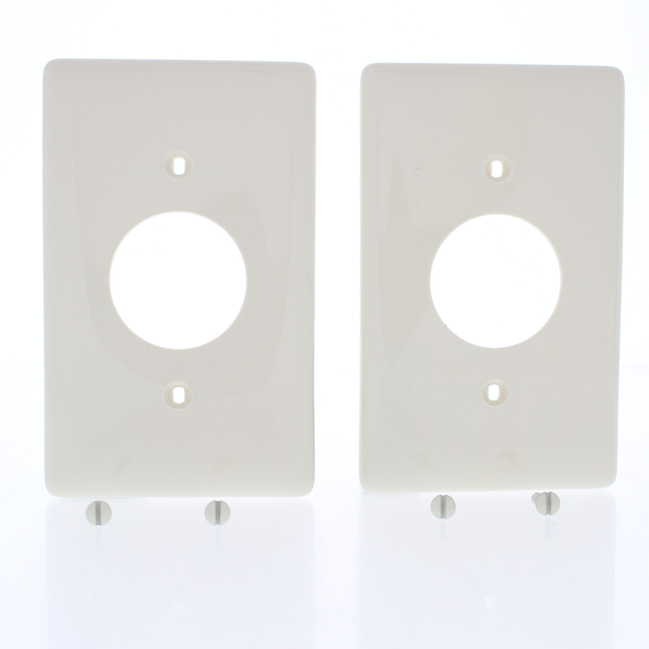 2 Hubbell NP7OW "Office White" (beige) single receptacle wallplates with a 1.406" diameter opening. Please note: Hubbell's "Office White" color is an off-white beige color; it is not a standard bright white - this is a special Hubbell color - popular in home offices, corporate offices, places of worship, etc. Typically used for range, welder, and dryer outlets. Commercial grade cover with slightly oversize dimensions, measuring 4.63"h x 2.87"w, that are an extra 1/8" in length and width than standard plates from other manufacturers for increased coverage around irregular wall openings. Made of a tough virtually unbreakable nylon - do not confuse it with regular plastic residential plates which can chip or crack. Features include: