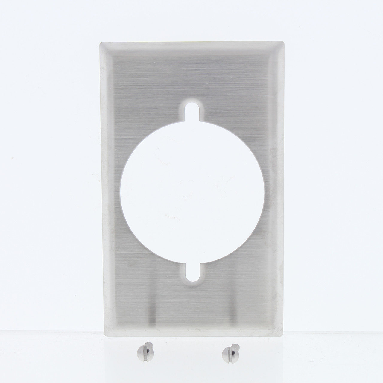Eaton 93221 stainless steel 1-gang outlet cover. Industrial grade with a 2.156" diameter receptacle opening. Typical use would be for straight blade power outlets such as the following Leviton part numbers: 278, 279, 5206, 5207, 5371, 5372, 5373, and 5374. Features include: