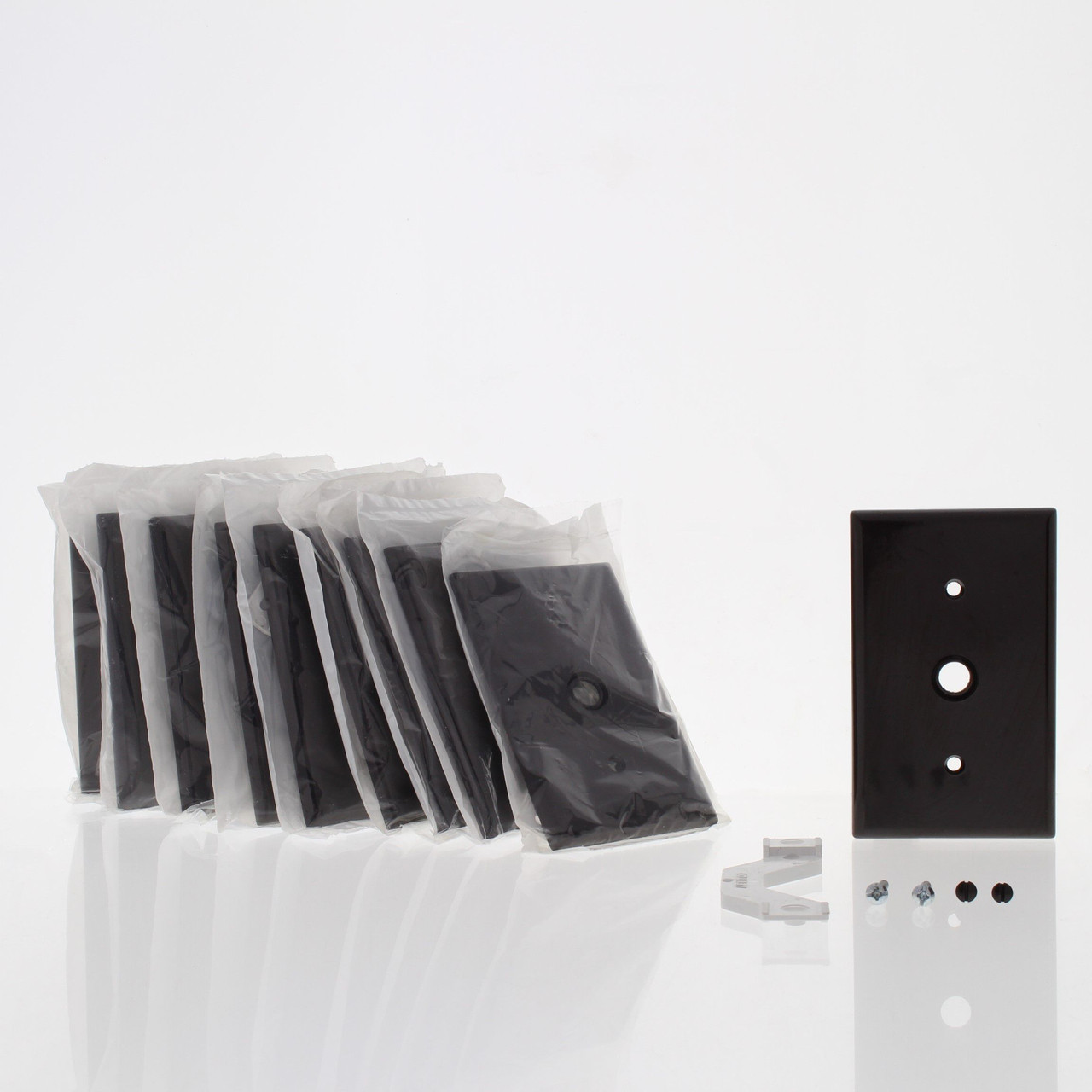 10 Leviton 85018 brown strap mount wallplates for telephone or cable connections. Residential Grade, strap mount, standard size plate, measuring 4.5"h x 2.75"w with a .407" diameter hole for telephone or cable applications; it can be enlarged to .625" by removing the knockout. Features include: