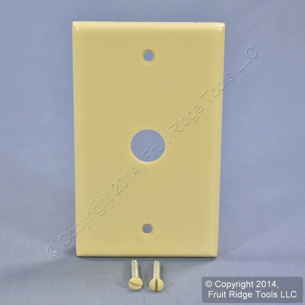 Leviton 86017 ivory wallplate for telephone or cable connections. Residential Grade, box mount, standard size plate, measuring 4.5"h x 2.75"w with a .625" diameter hole for telephone or cable applications. Features include: