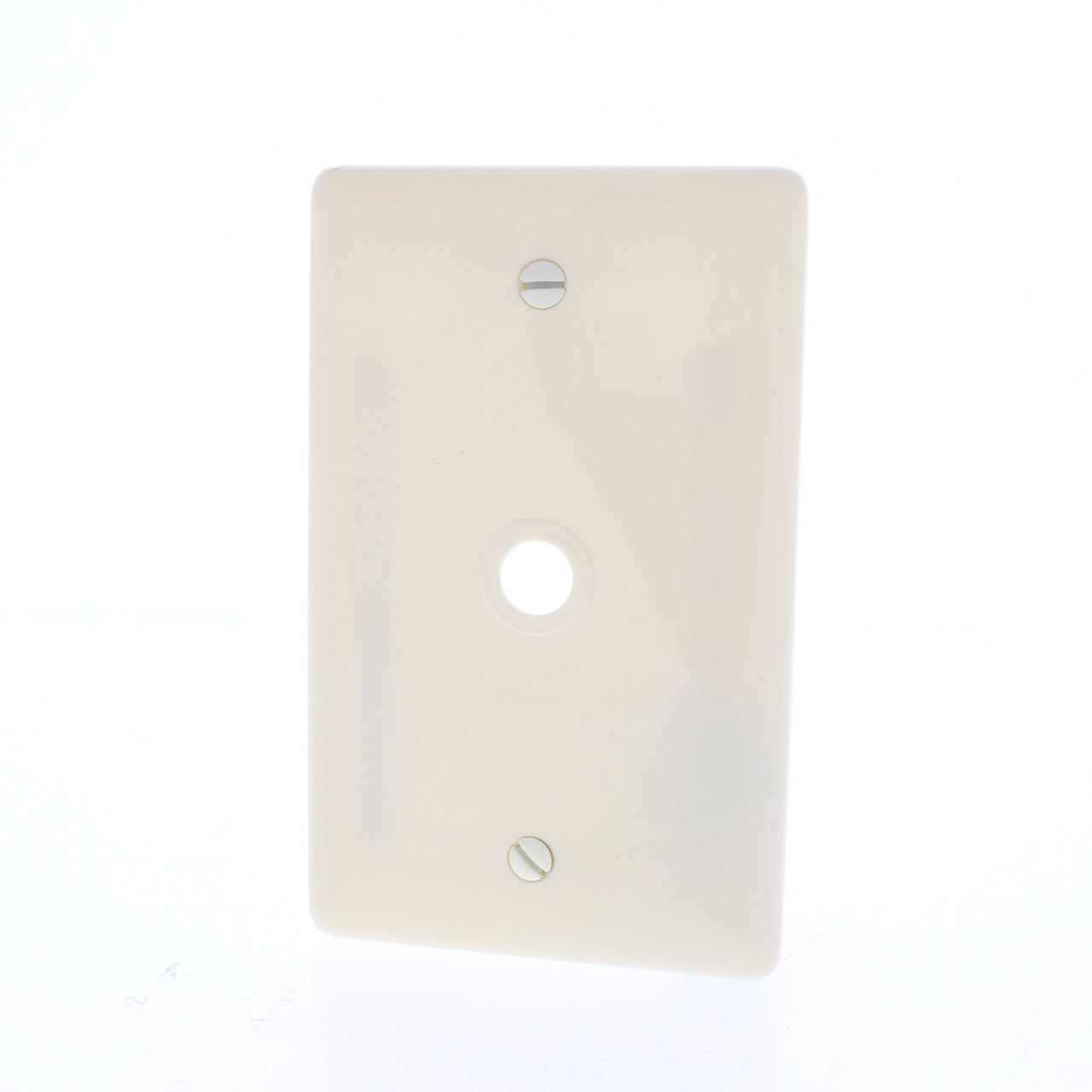 3 Hubbell NP11AL almond .406" hole telephone/cable thermoplastic wallplates. Commercial grade cover with one .406" diameter opening for cable, telephone or similar applications. Slightly oversize dimensions, measuring 4.62"h x 2.87"w, provide an extra 1/8" in length and width than standard plates from other manufacturers to provide increased coverage around irregular wall openings. Made of a tough virtually unbreakable nylon - do not confuse it with regular plastic residential plates which can chip or crack. Features include: