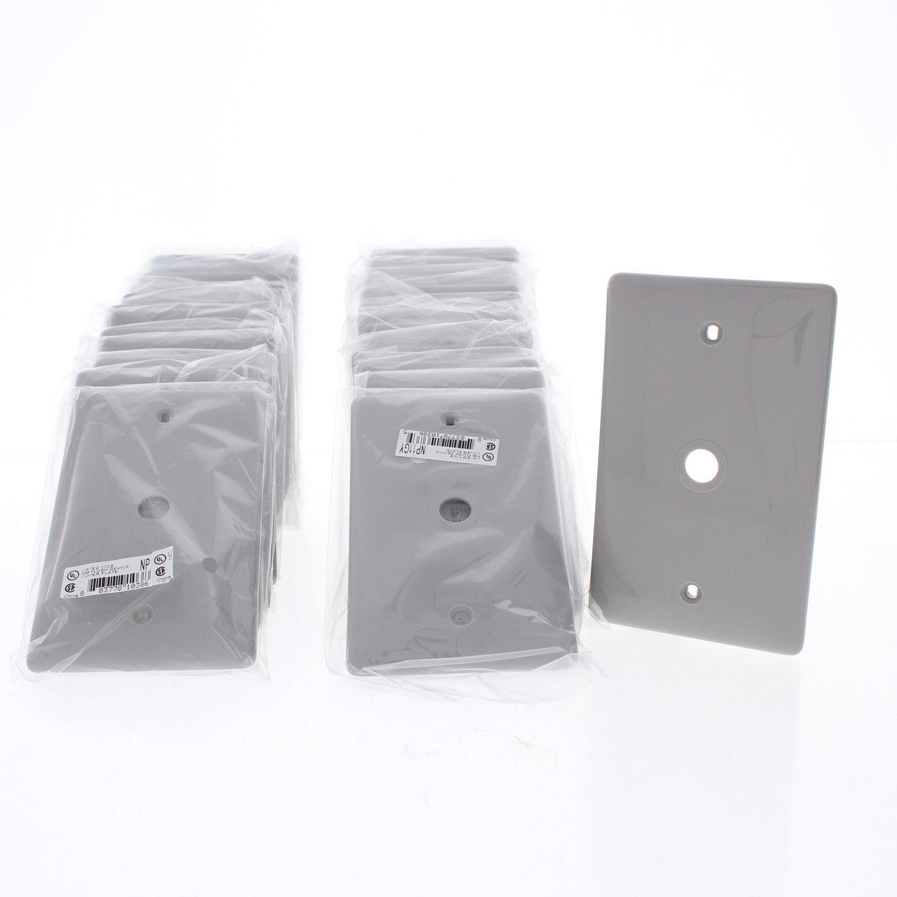 25 Hubbell NP11GY gray .406" hole telephone/cable thermoplastic wallplates. Commercial grade cover with one .406" diameter opening for cable, telephone or similar applications. Slightly oversize dimensions, measuring 4.62"h x 2.87"w, provide an extra 1/8" in length and width than standard plates from other manufacturers to provide increased coverage around irregular wall openings. Made of a tough virtually unbreakable nylon - do not confuse it with regular plastic residential plates which can chip or crack. Features include:
