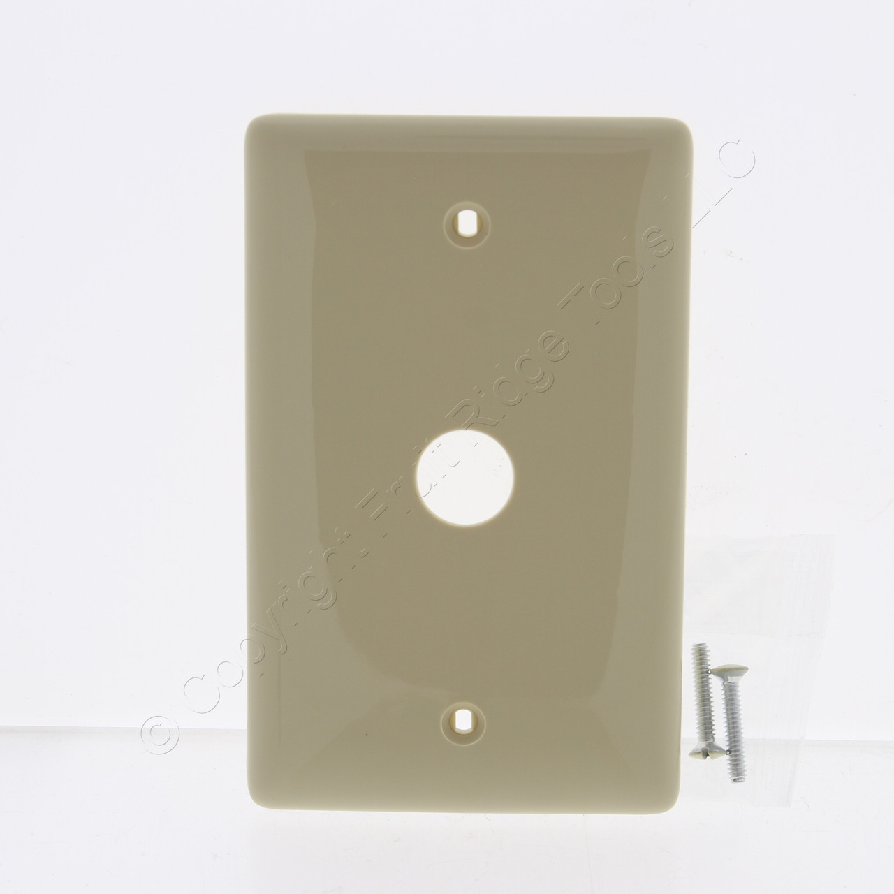 Hubbell NP737I ivory telephone/cable wallplate (box mount) with a 0.625" opening. Commercial grade cover with one .625" diameter opening for cable, telephone or similar applications (box mount design). Slightly oversize dimensions, measuring 4.62"h x 2.87"w, provide an extra 1/8" in length and width than standard plates from other manufacturers to provide increased coverage around irregular wall openings. Made of a tough virtually unbreakable nylon - do not confuse it with regular plastic residential plates which can chip or crack. Features include: