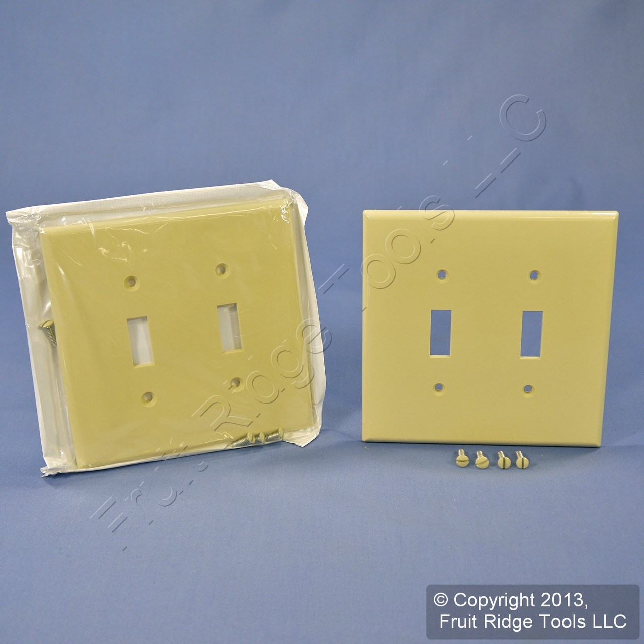 2 Leviton Decora PJ2-I ivory 2-gang toggle switch covers. Commercial Grade, made of a high-performance unbreakable thermoplastic for high abuse environments; do not confuse them with regular residential grade wallplates which can chip and crack. Midway size, measuring 4.88"h x 4.94"w, 3/8" higher and wider than standard size covers for use with larger size wall boxes and to hide irregularities on the surrounding wall. Features include: